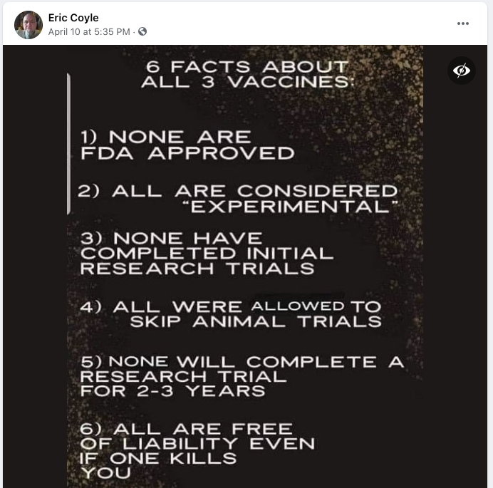 A viral Facebook post lists “6 facts” about the three COVID-19 vaccines currently in use in the United States. These “facts” are listed as follows: “none are FDA approved, all are considered ‘experimental,’ none have completed initial research trials, all were allowed to skip animal trials, none will complete a research trial for 2-3 years, all are free of liability even if one kills you.”