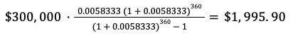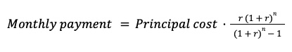 Monthly mortgage payments can be calculated with the following formula, where r is the monthly interest rate and n is the number of months of payment.