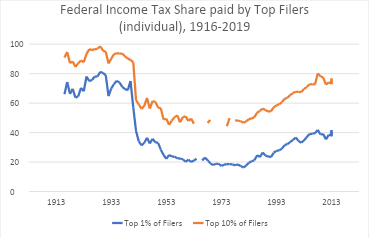 We can see the intended progressivity of the federal income tax system by looking at who shoulders the income tax burden. The figure below displays the share of the federal income tax burden carried by the top 1 percent and top 10 percent of earners over time.