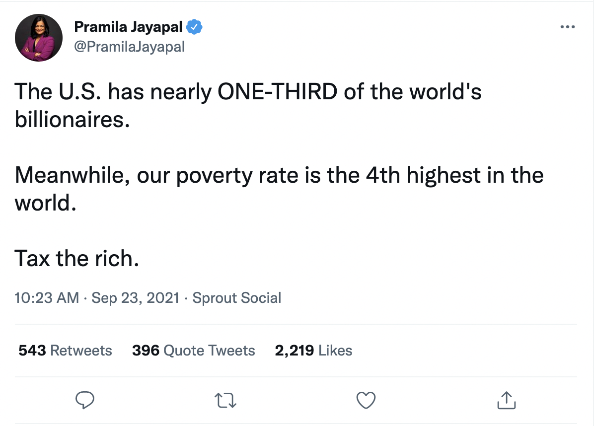 Washington state Democratic Rep. Pramila Jayapal claimed in a since-deleted tweet that the United States has one-third of the world’s billionaires and the fourth highest poverty rate in the world.