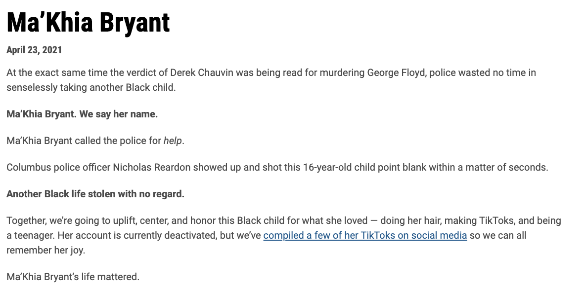 The Black Lives Matter Global Network Foundation released a statement on April 23 in response to the death of Ma’Khia Bryant. The website states: “Ma’Khia Bryant called the police for help. Columbus police officer Nicholas Reardon showed up and shot this 16-year-old child point blank within a matter of seconds.”