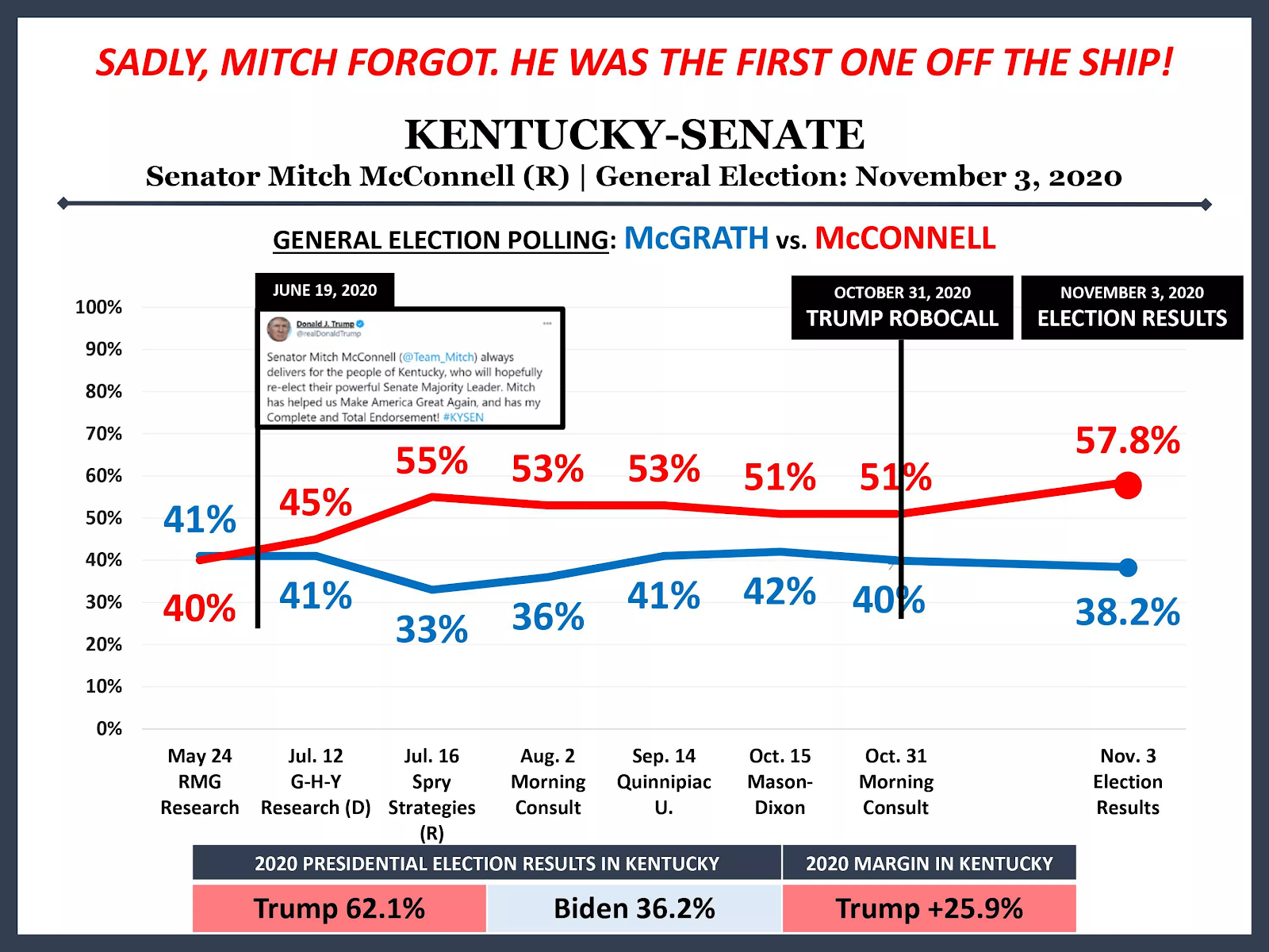 It wasn’t enough. Unless McConnell agreed to help Trump steal the election, it was never going to be enough. The president on Monday night sent a slide around to Republican lawmakers pointing to what he believed to be his own role in McConnell’s election victory, decrying the Kentucky Republican for being “the first one off the ship.”