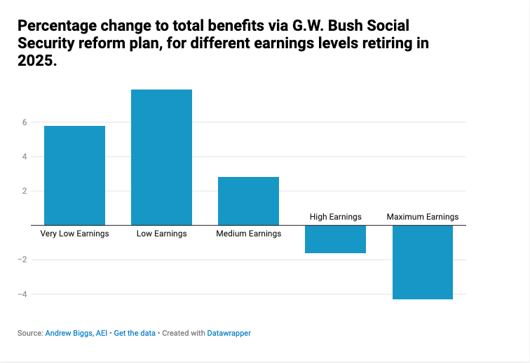 In a new study released by the American Enterprise Institute, I modeled the effects on Social Security retirement benefits if Bush’s plan had been implemented, while incorporating the changes to traditional benefits via progressive price indexing as well as how real-world investment returns since 2005 would have determined the benefits paid from personal retirement accounts.
