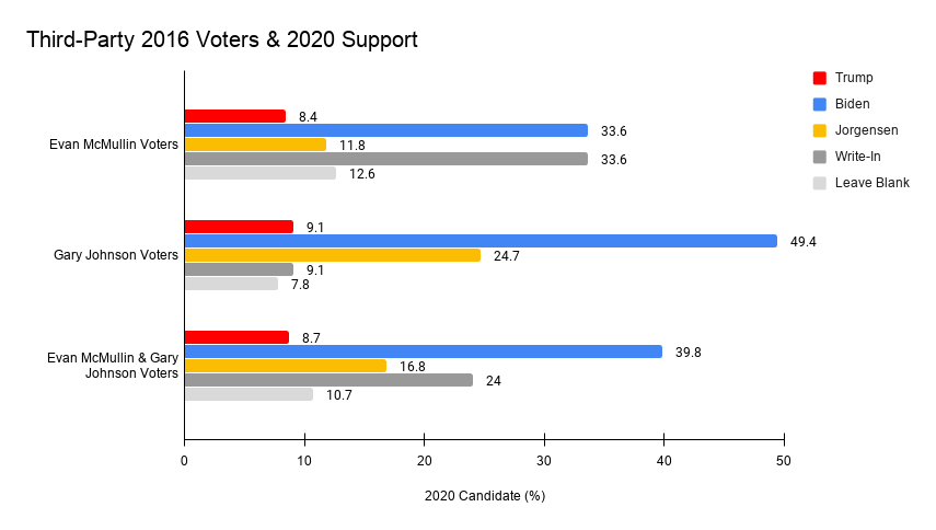 But in an informal survey of Dispatch readers who supported McMullin or Johnson in 2016, very few are planning on or leaning toward voting to re-elect the president. In fact, of approximately 200 respondents who had a relatively clear idea of their November intentions, Trump trailed not only Biden, but Jorgensen, write-in candidates, and leaving the presidential line on the ballot blank.