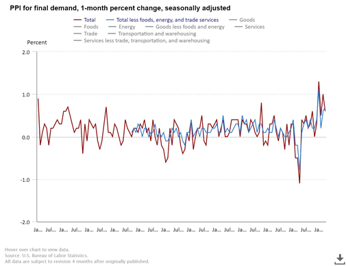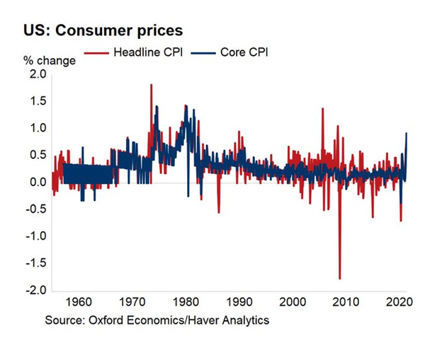 Both the U.S. economy and financial markets are—to use a technical term—really screwy right now. Supply chains (domestic and global) are stressed and companies are “panic buying”; unemployment remains extremely elevated, yet employers say they can’t find workers (even as they’re raising wages); and consumer and producer prices have spiked—especially in intermediate inputs (steel, lumber, chemicals, etc.), food and energy, and housing. And don’t even get me started about the craziness that is Dogecoin, or NFTs, or “meme stocks,” or … you get the idea. Anyway, we’ve covered some of this stuff in previous newsletters, and things have probably gotten a little more unstable following the release of April’s job numbers (lower than expected) and inflation data (higher than expected). On the latter front, both the consumer price index (CPI) and producer price index (PPI), which are intended to measure economy-wide price pressures, have both spiked significantly. Year-over-year comparisons are misleading right now because prices collapsed at this time last year (which makes annual gains appear abnormally large) but both monthly increases were also quite high—and, perhaps more importantly, well past economists’ expectations.