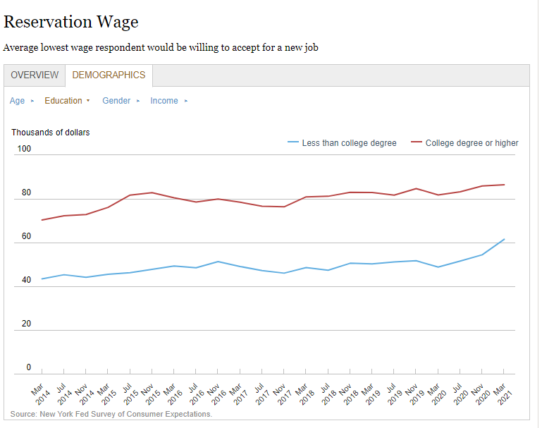 Per Jed Kolko, The self-reported “reservation wage” (the lowest wage a worker is willing to accept for a particular job) is up 26 percent since last year for workers without a college degree. The annual gain averaged only 2 percent over the previous six years.