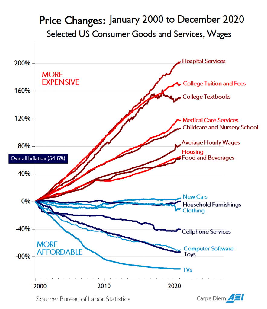 By contrast, today’s fears are that price increases are more widespread—i.e., the worry is less about isolated spikes in prices for things like lumber (though these things can hurt) and more about persistent increases in many goods and services that combined erode living standards and could spiral out of control.