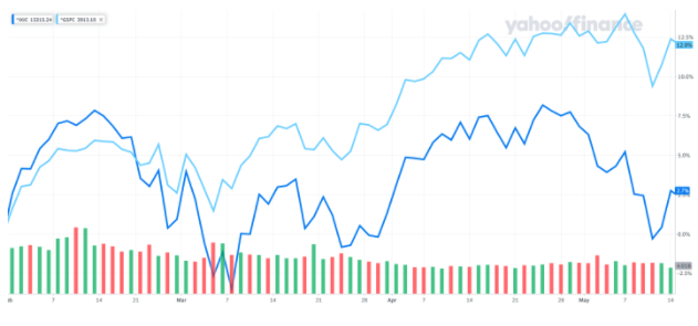 More recent data (and plenty of anecdotes) indicate that price pressures—potentially a harbinger of long-term inflation—are continuing this month. Stock and bond markets have thus been gyrating pretty wildly in recent weeks (especially the tech-heavy NASDAQ—the darker blue line in the chart below, when compared with the broader S&P 500 in lighter blue); politicians have started pointing fingers and sharing Jimmy Carter memes; and many people are left wondering if this is all a momentary, pandemic-related blip or something worse (i.e. Carter-era stagflation)—a question whose answer could have serious implications for future U.S. fiscal and monetary policy.