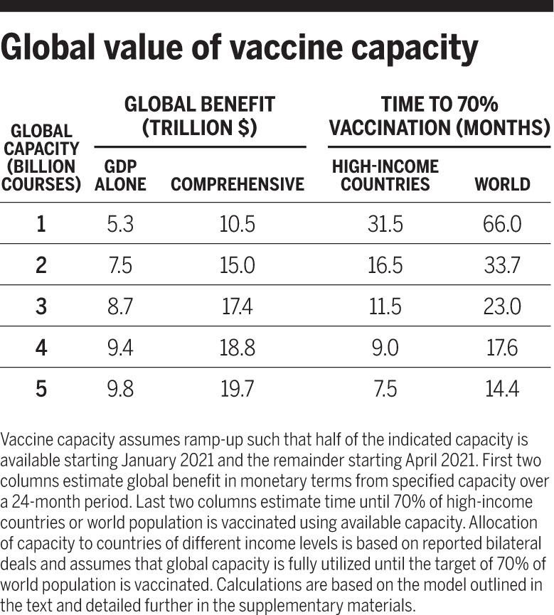 Such estimates are obviously rough, but they do allow us to have some much-needed perspective—and a back-of-the-napkin calculation—about the scale of the Pfizer/BioNTech and Moderna profits in relation to the overall benefits that these companies’ sales have provided the world. Assuming, for example, that BioNTech/Pfizer, which plan to have vaccine production capacity of 4 billion doses (2 billion courses) in 2022, each make even as much as $40 billion in profit by 2023 (a liberal guess given the data above), that would be only about 1 percent of the $7.5 trillion in global GDP gained—and slightly more than 0.5 percent of the $15 trillion in total social benefits—from those 2 billion courses:
