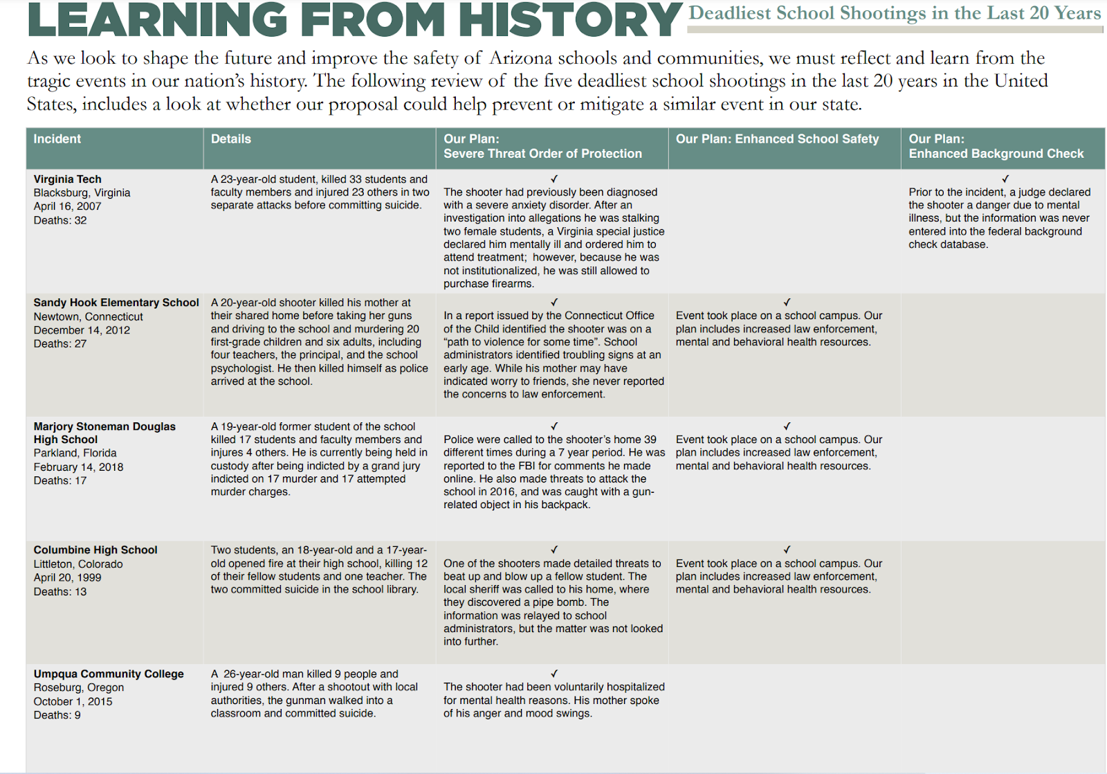 In 2018—after the horrific school shooting in Parkland, Florida, Arizona Gov. Doug Ducey proposed a comprehensive safe schools program that incorporated a series of measures that were based on careful analysis of each and every significant school shooting since Columbine. I’d urge you to read the entire document. Ducey proposed enhanced background checks, an increased security presence at schools, and increased mental health resources. He also proposed a red flag law, and to support that proposal he included this chart (which may be easier to read here):