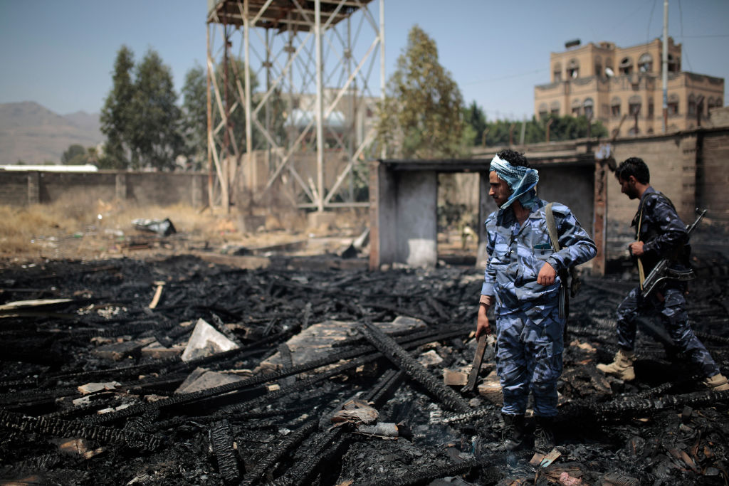 Yemeni police inspect damage from an airstrike. (Photo by Hani Al-Ansi/picture alliance via Getty Images)
