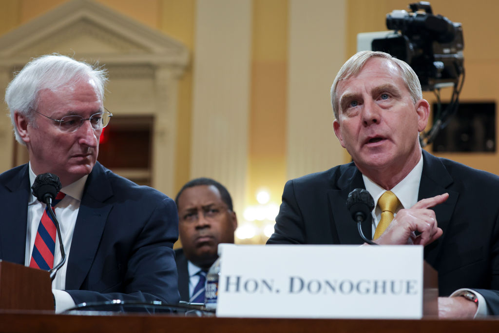 Thursday’s January 6 Committee hearing focused primarily on what transpired at the DOJ between November 2020 and January 2021. Featuring testimony from Jeff Rosen and Richard Donoghue—the Justice Department official who succeeded Barr for a few weeks on an acting basis and his top deputy—the panel pieced together a devastating timeline detailing, essentially, Trump’s descent into election conspiracy madness and his efforts to bring his officials down with him.