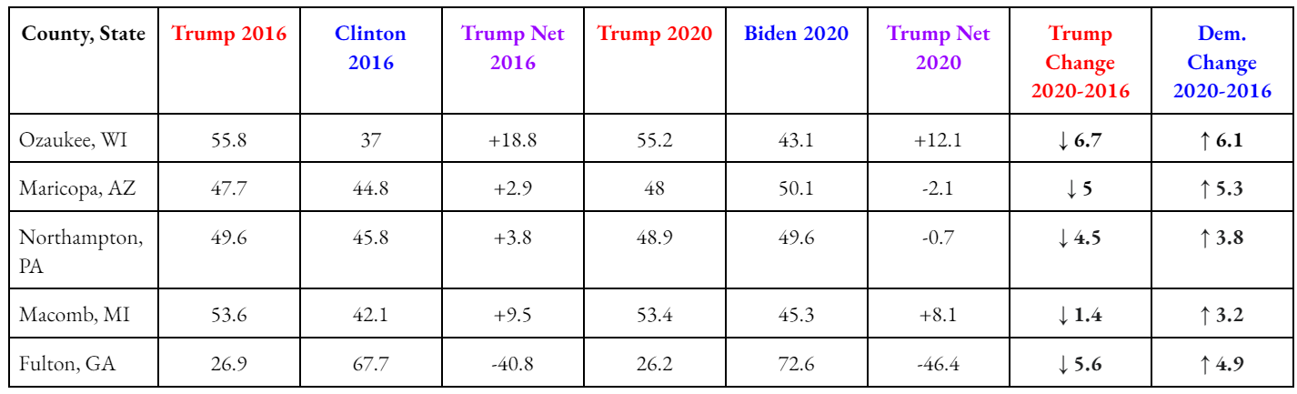 The problem for Republicans is that Trump is not a good choice even if one lays aside the constitutional and characterological considerations about his abuse of his office. Take a look here at this chart which shows the difference in Trump’s performance in key counties from 2016 to 2020:
