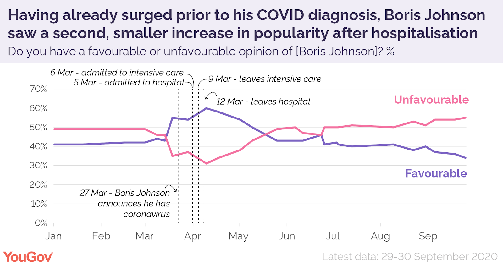 But is the sympathy bounce real? U.K. Prime Minister Boris Johnson’s coronavirus infection and subsequent hospitalization last spring provide perhaps the most analogous example. Johnson’s approval rating, per YouGov, jumped up in late March—prior to his own diagnosis—as COVID-19 enveloped Great Britain and the world. It ticked up a bit more, from 54 to 60 percent, when Johnson underwent his own struggle with the virus and was moved to intensive care. It’s impossible, of course, to know for sure whether that bump was entirely attributable to his hospitalization, but we do know this approval was back down to 54 percent in less than a month, and at 43 percent in a month-and-a-half. If he did get a “sympathy bounce,” it was both immediate and short-lived.