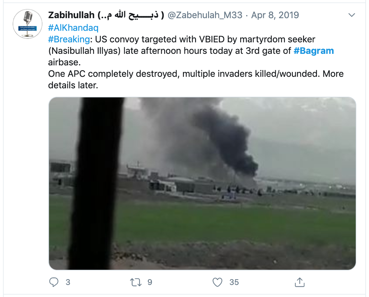 Zabihullah’s tweet also indicated that the suicide bombing had been carried out as part of the Taliban’s “Al Khandaq” operations, a name that is intended to pay homage to one of the earliest conflicts in Islamic history—the “Battle of the Trench.” Therefore, as far as the Taliban is concerned, the April 2019 suicide bombing outside of Bagram was simply part of its latest offensive campaign.